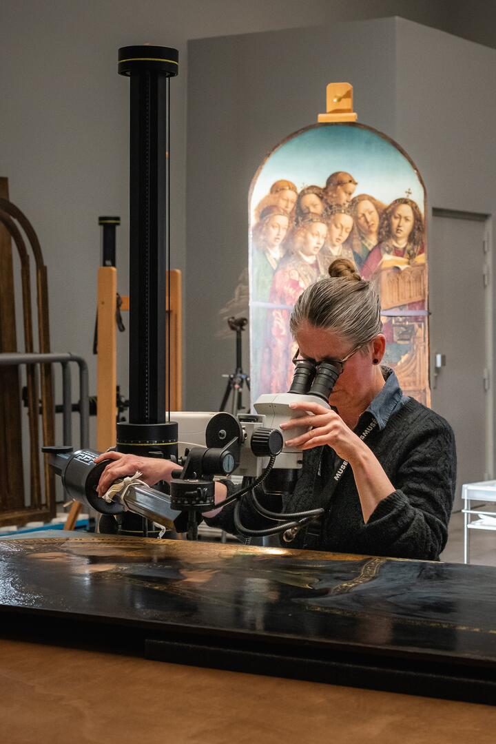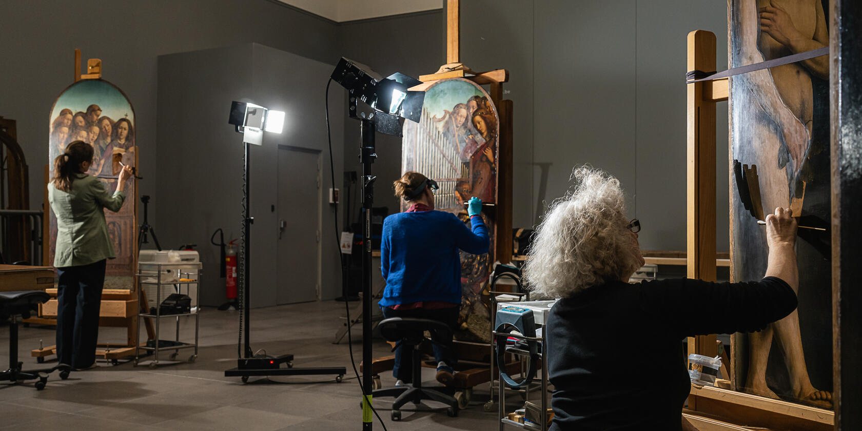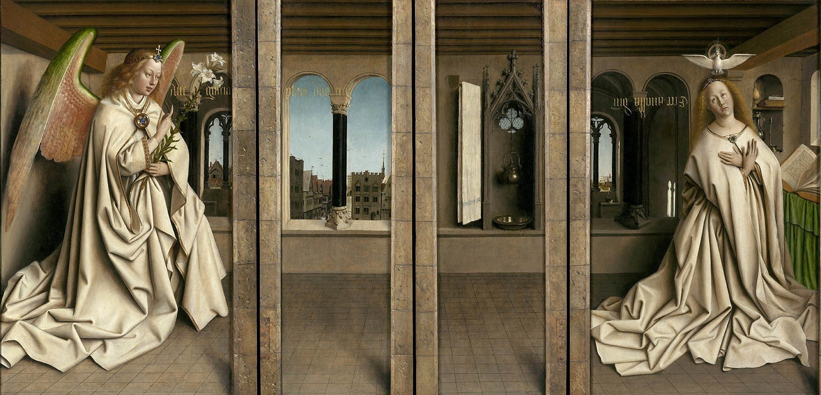 Composto por dezoito painéis em carvalho, o retábulo reúne uma série de visões bíblicas, cujas figuras repousam no limiar entre o humano e o sagrado. As superfícies foram cobertas por finas camadas de giz e cola animal antes de receberem a pintura a óleo — técnica que Jan van Eyck dominou como ninguém. A aplicação meticulosa de camadas transparentes confere às figuras uma luminosidade quase sobrenatural, como se a luz irradiasse de dentro para fora.