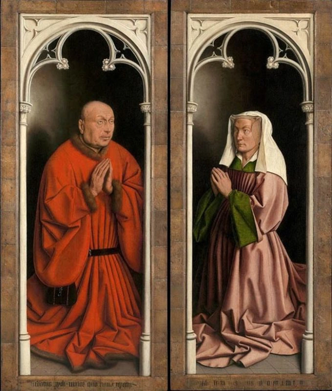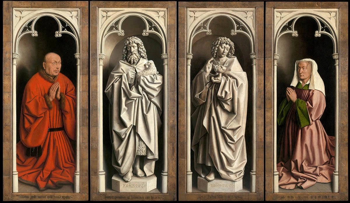 Os patrocinadores. O Retábulo de Ghent foi originalmente instalado acima do altar de uma capela fundada por Joos Vijd e sua esposa Elizabeth Borluut. São estes abaixo, também retratados na obra.